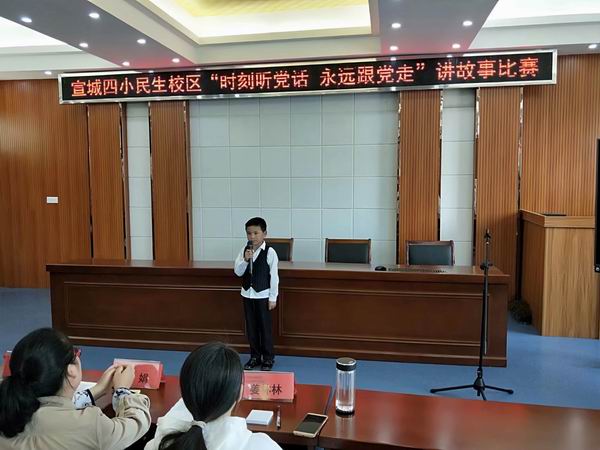 本次比赛在学校德育处和少先队精心组织下,全校学生以班级单位,一至六年级各班推荐二名选手(男、女各一名)代表班级参赛,在 辅导老师指导下,积极参与,热情高涨。选拔赛在学校多功能室举行,全校共44名选手参加了角逐。比赛中,参赛选手们精神饱满、声音悦 耳,故事情节丝丝入扣。他们用抑扬顿挫的语调、真挚的情感、生动的肢体语言,将一个个令人感动、振奋人心的故事情景活灵活现地展现在大家面前,博得了现场观众的阵阵掌声。最后我们校区推荐李继轩、沈安博、屈默冉、姚越四名同学代表校区参加校级比赛。
