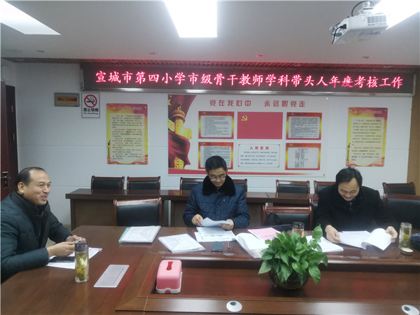 2019年12月19日,区教体局人事科相关领导对我校教育系统市级学科带头人青年骨干教师开展年度考核工作。对八位教师在教学视导和示范、公开课教学、接受或承担继续教育教学和支教情况、培养指导青年教师情况、承担教育科研课题、论文论著和成果、教育教学工作成绩等各方面履行职责情况进行考核,对八位教师在工作中发挥骨干带头和示范辐射作用表示满意,同时对我校骨干教师实行动态管理做法,给予充分肯定。