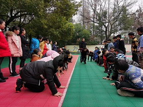 方法:以篮球场中间横线为中线,篮球场边线处为安全线。把学生分成人数相等的两队,面对面分开站在中线两端【相隔1m】,一方为黄河,另一方为长江。游戏开始,教师喊"长江",长江队迅速向安全线跑,"黄河"立即追赶,凡是在安全线前拍着对方胜利。反之一样。失败者罚俯卧撑5个。