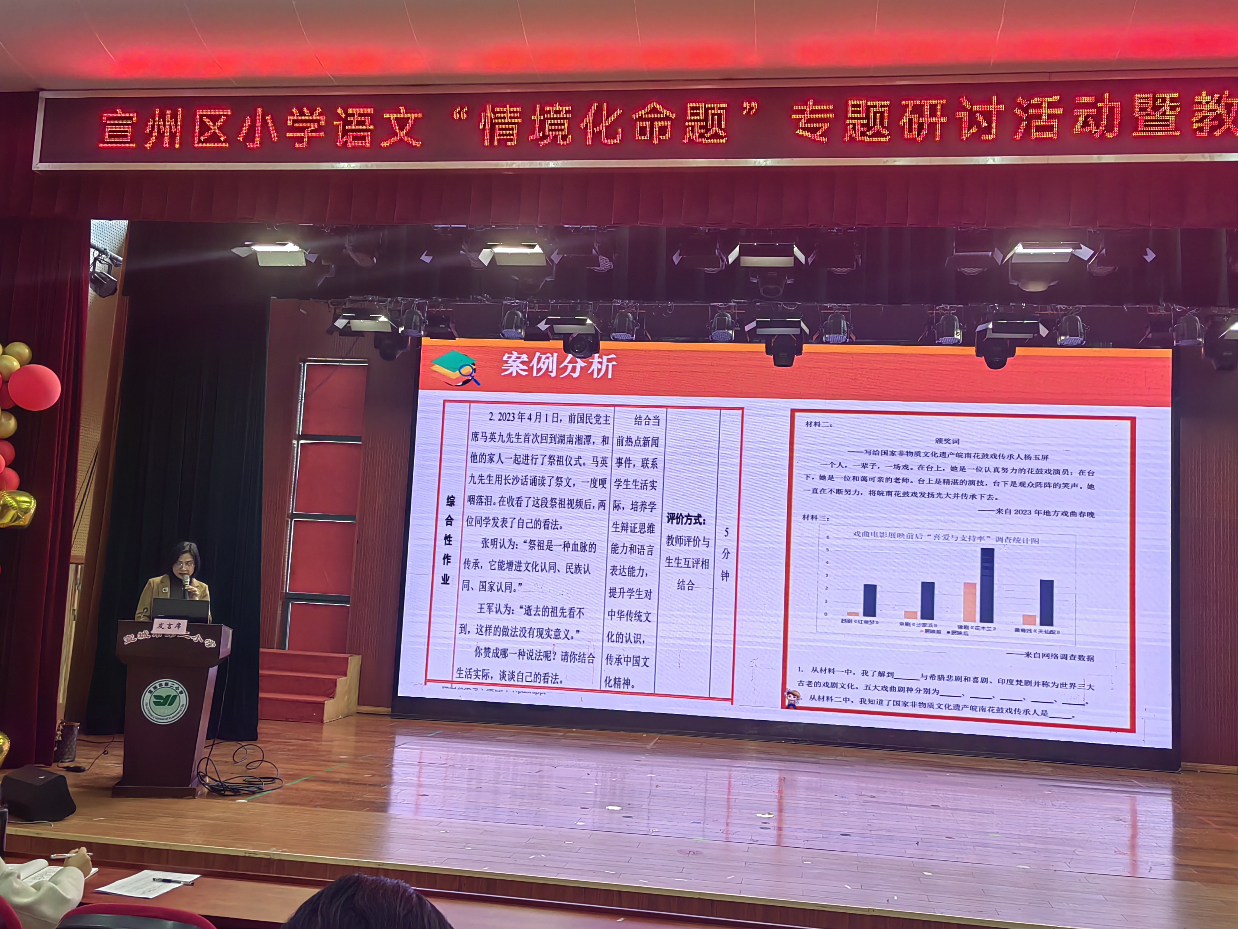 3月12日,在全区小学语文“情境化命题”专题研讨活动中,我校语文教研组长陈从红老师代表语文组,以“情境作业巧设计,立足素养促提升”为主题,向全区小语同仁分享了我校语文组在情境化大单元作业设计的几点探索。