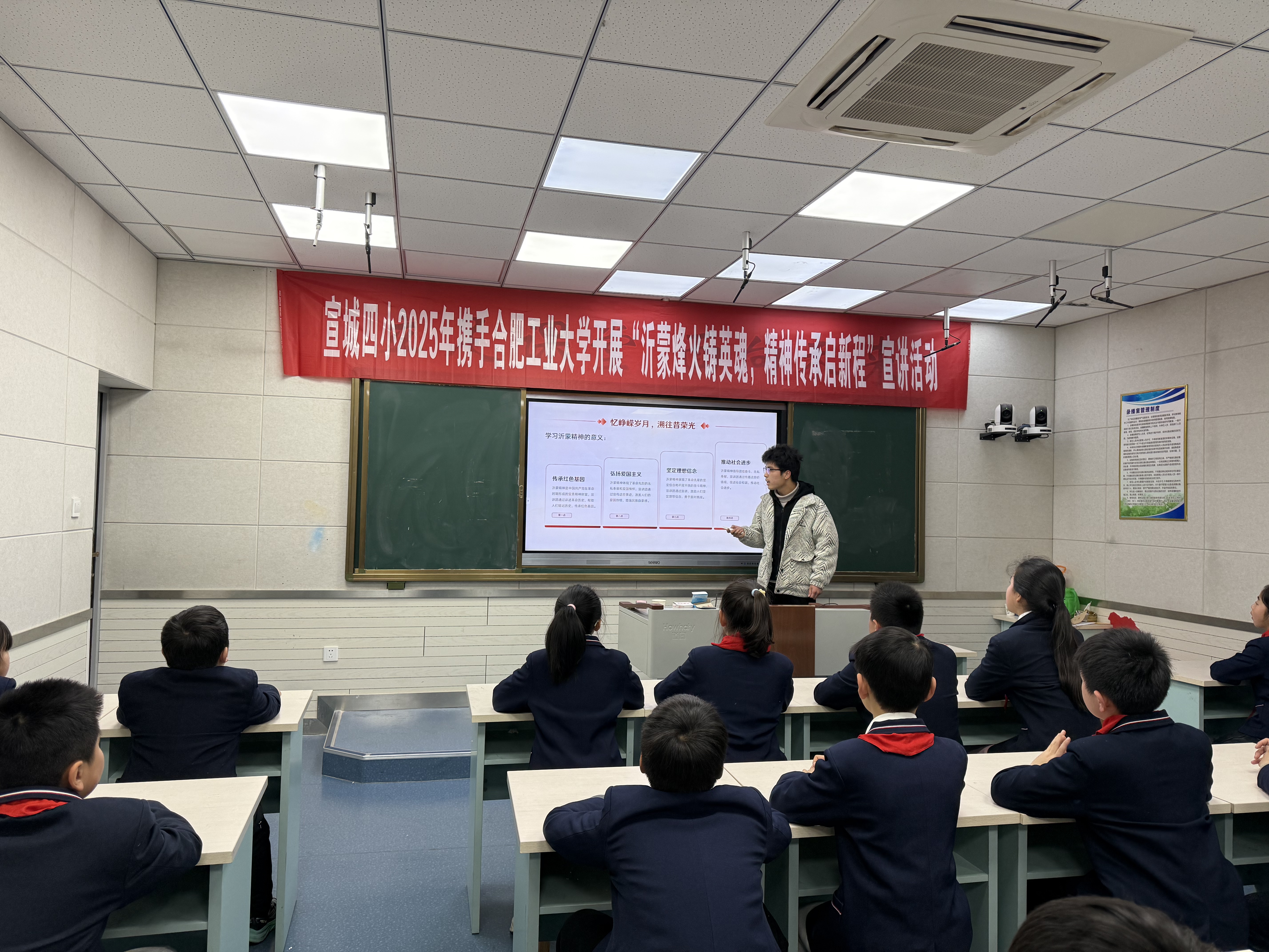活动现场,合肥工业大学“皖韵沂风”大学生志愿宣讲团通过丰富多样的形式,如生动的故事讲述、珍贵的历史图片展示、感人的视频播放等,向宣城四小的师生们全面而深入地介绍了沂蒙精神。从沂蒙红嫂用乳汁救伤员的感人故事,到沂蒙六姐妹积极支前的英勇事迹,每一个细节都让师生们深刻感受到了沂蒙人民在革命战争年代爱党爱军、开拓奋进、艰苦创业、无私奉献的伟大精神内涵。
