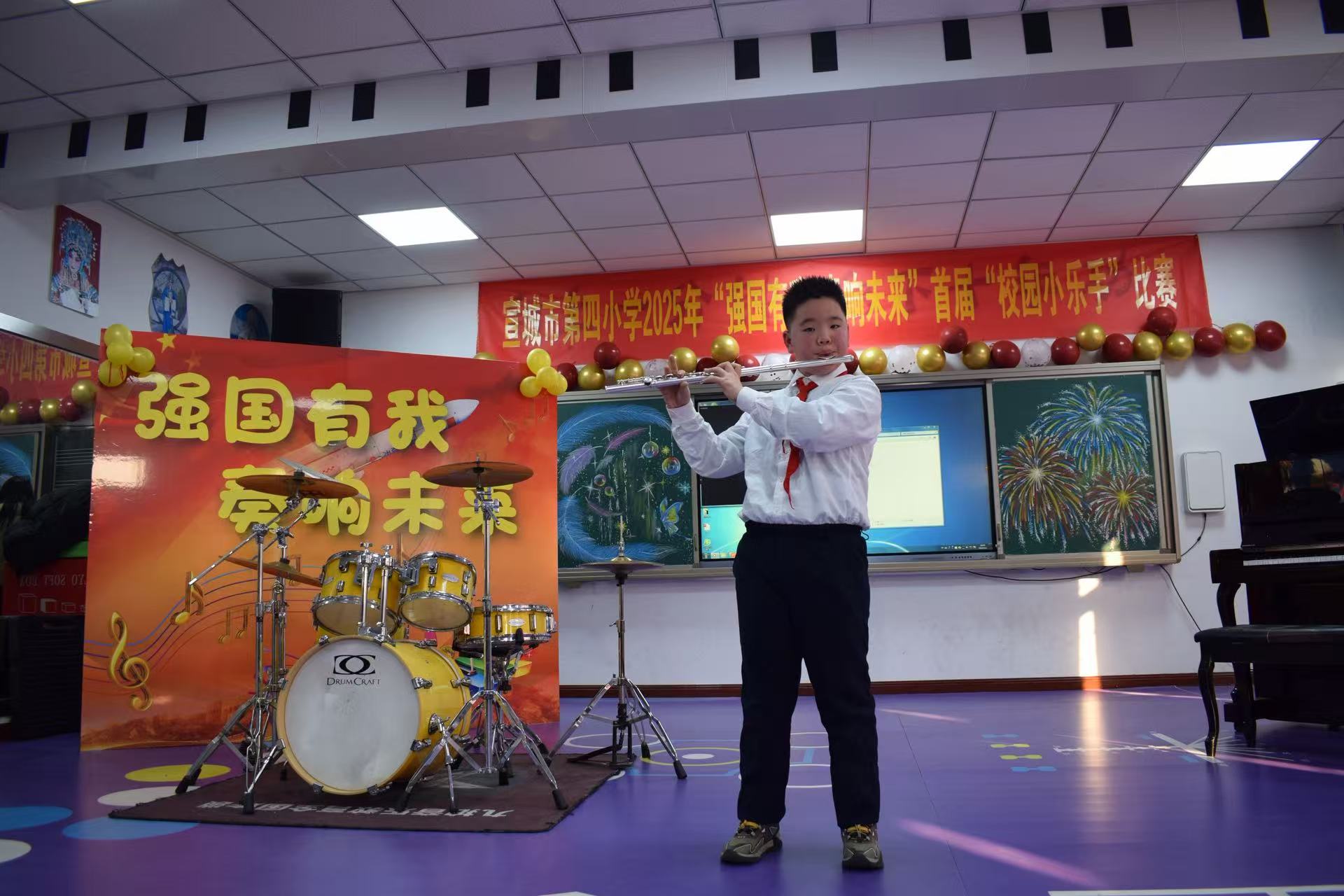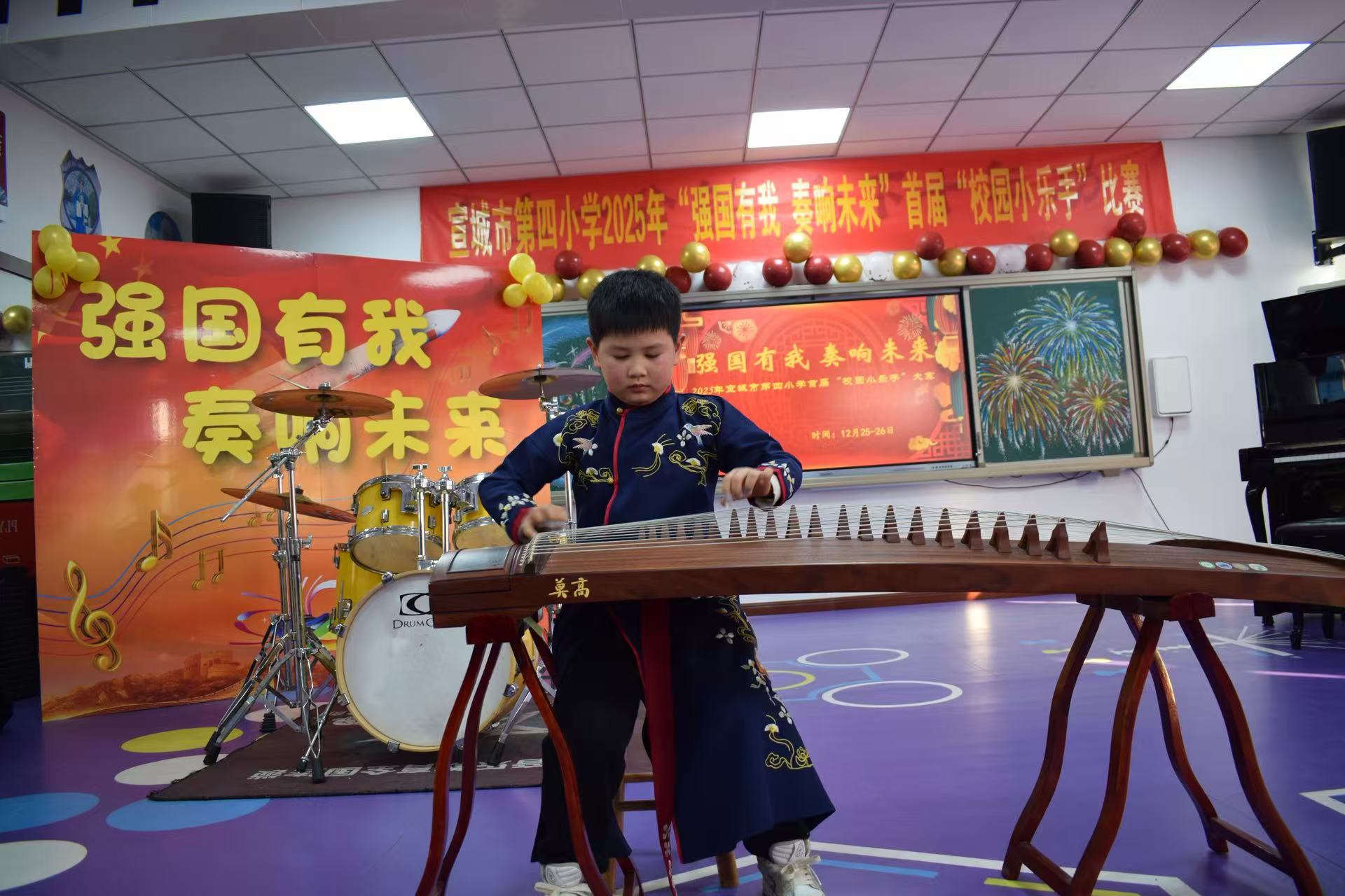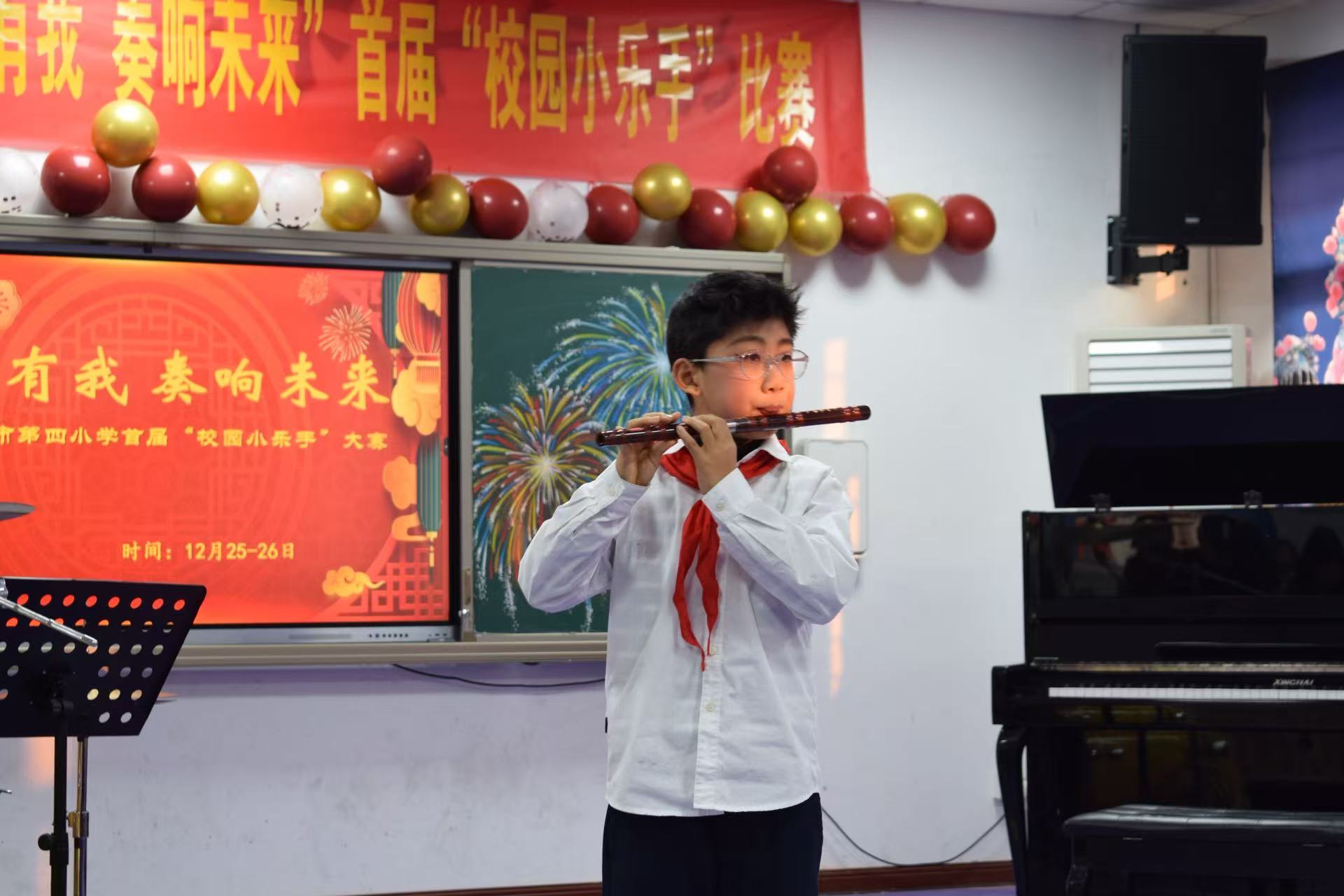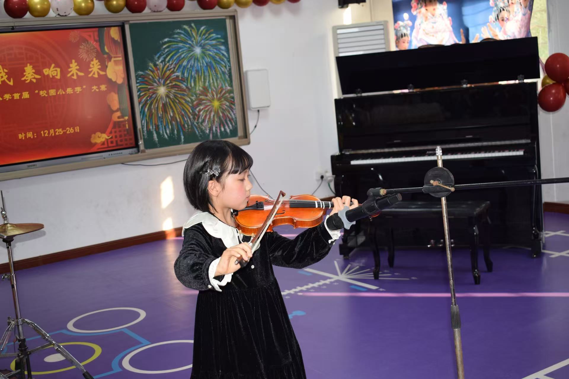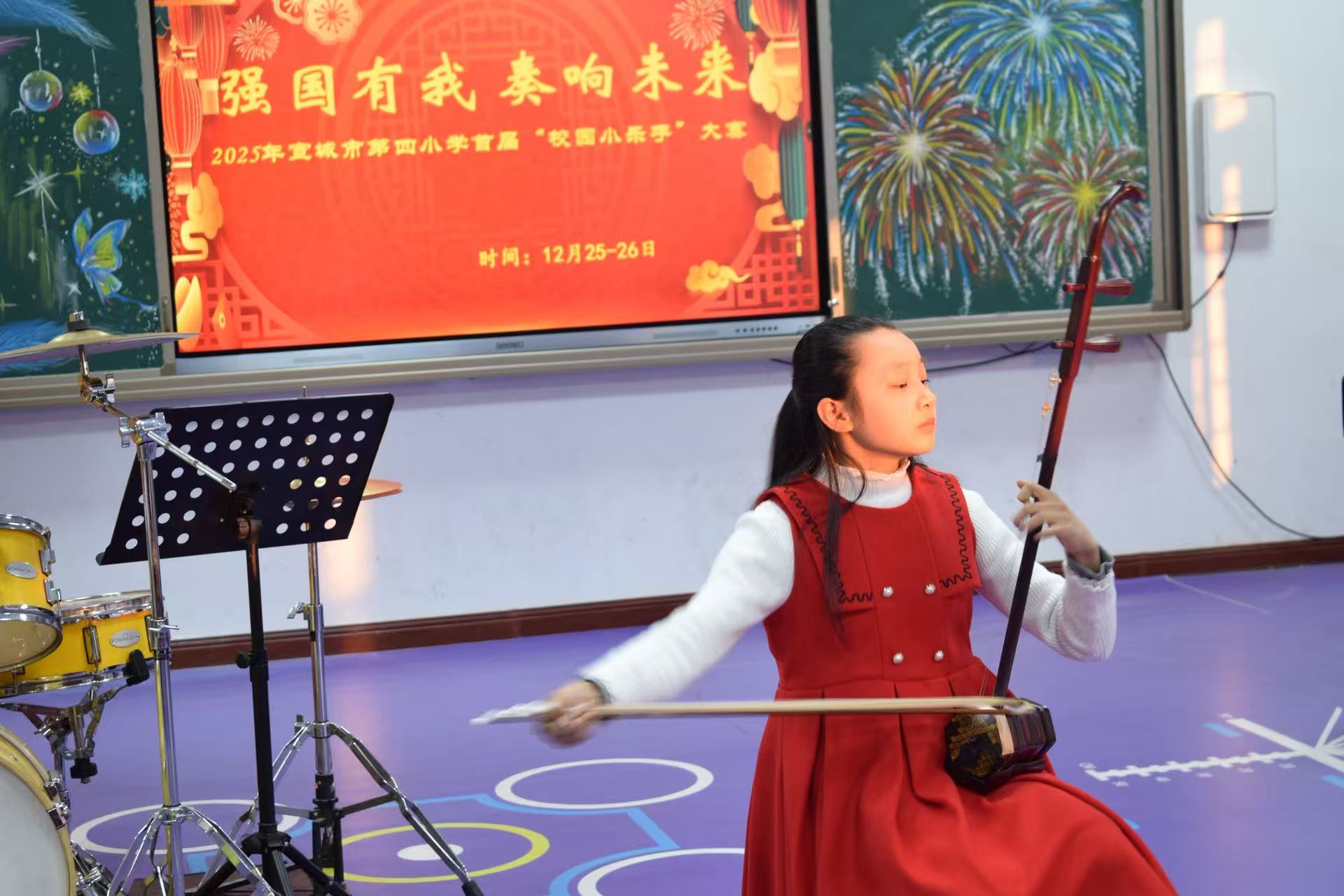 12月25日下午,高年级组比赛率先拉开帷幕。舞台上,四五六年级的小乐手们台风稳健、自信昂扬,钢琴的悠扬、古筝的清雅、小提琴的灵动、二胡的醇厚、架子鼓的铿锵与长笛的婉转交相辉映,展现出扎实的演奏功底与多元的艺术审美。指尖跳跃间,鼓点铿锵处,不仅是技艺的比拼,更是少年们对“强国有我”的深情诠释。