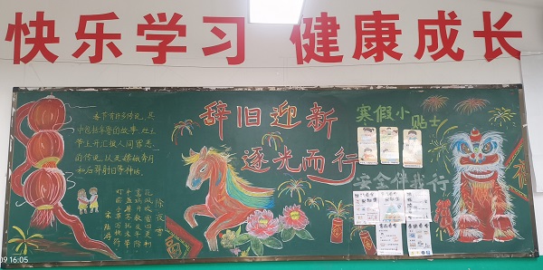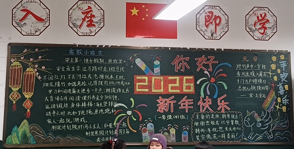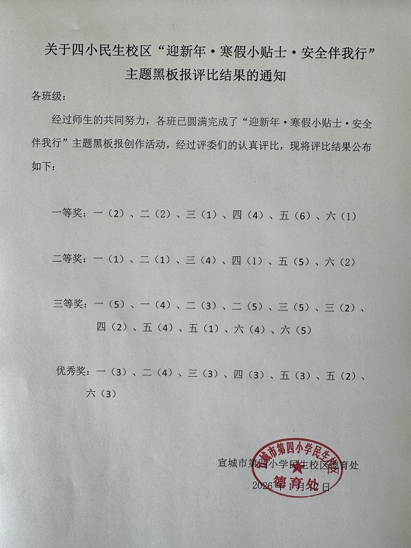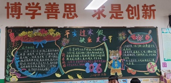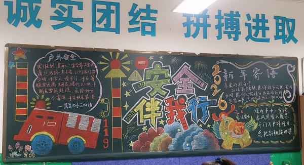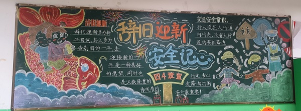 为迎接新年到来,强化学生寒假安全意识,宣城市第四小学民生校区近期开展“迎新年·寒假小贴士·安全伴我行”主题黑板报评比活动。全校各班级积极参与,师生共同构思、精心创作,将寒假交通安全、消防安全、防溺水安全等知识融入黑板报设计,既展现了班级风貌,又传递了安全理念。