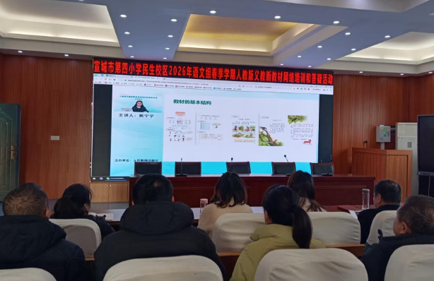 为深入贯彻党和国家教材建设管理要求,落实教育部及人民教育出版社关于义务教育国家课程新修订教材使用培训工作部署,确保教师准确把握新教材内涵、实现培训全覆盖,2月4日,宣城市第四小学民生校区1-3年级语文教师,在学校阶梯教室集中开展人教版语文新修订教材专题学习活动。 本次学习紧扣人教社2026年义教新教材网络培训与答疑核心内容,重点研读语文新教材下册编写思路、核心内容解析、教学指导与实施建议,同时针对已投入使用的上册教材开展问题答疑与经验梳理。参训教师认真聆听、细致记录,围绕教材修订要点、教学实施难点、课堂落地策略展开交流研讨。 此次集中学习,帮助语文教师进一步明晰新教材的编排逻辑与育人导向,为新学期精准施教、高效落实新课标理念筑牢基础,助力学校语文教学质量稳步提升。