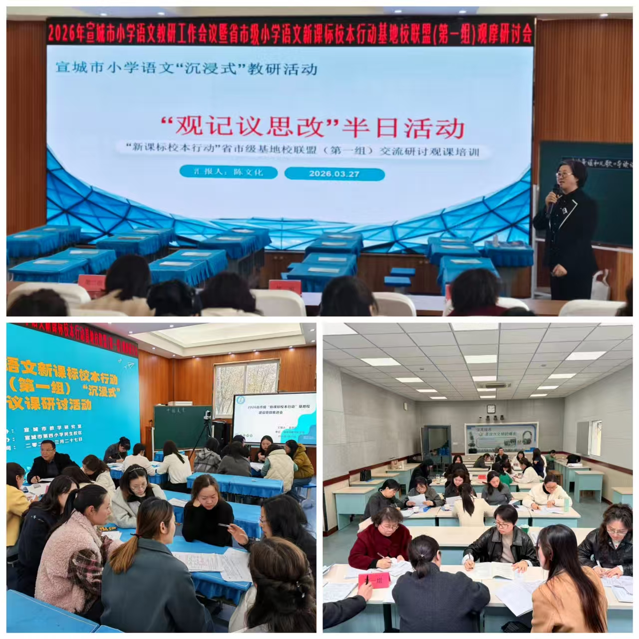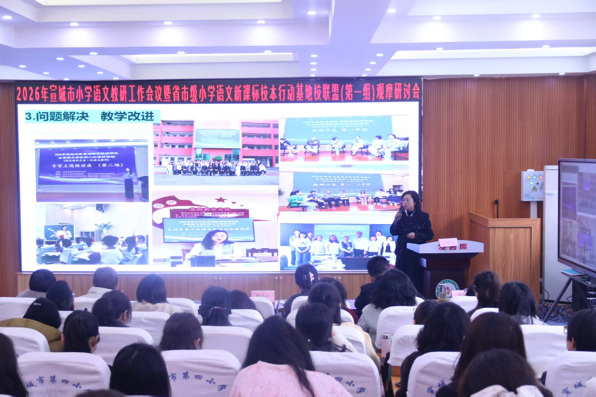 2026年3月27日,宣城市小学语文教研工作会议暨省市级小学语文“新课标校本行动基地校联盟”(第一组)教学研讨会在宣城市第四小学民生校区顺利召开。本次会议以新课标理念落地为核心,聚焦学与教方式改进,通过成果交流、教学观摩、沉浸式教研等多元形式,搭建起全市小学语文教研交流的优质平台,各县市区教研员、市县级专家指导团队成员、宣城市小学语文学科中心教研组成员、省市级基地校负责人、骨干成员、省市级基地校联盟校(第一组)骨干成员齐聚一堂,共研教学提质之路。