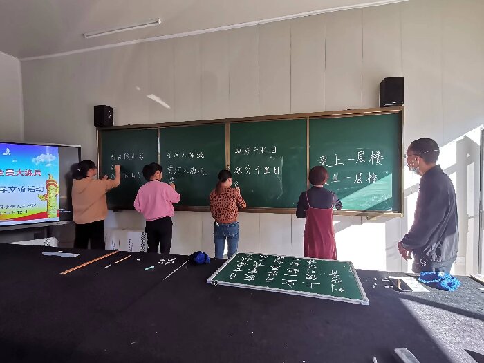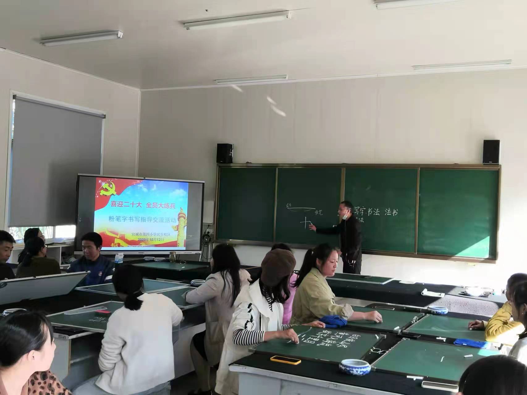 10月12日下午,四小民生校区书法教室热闹非凡。“喜迎二十大 全员大练兵”之粉笔字书写指导交流活动正在如火如荼地进行中。本次活动由教导处汪明主任主持,吴世金老师担任主讲。吴老师从写字与书法的区别、笔法、间架结构、留白等方面对教师们进行了专业指导,老师们认真聆听之后,各年级组选派代表进行了实战演练。希望通过本次粉笔字练兵活动,教师们能够提高粉笔字书写水平,更好地指导学生书写汉字,有效推动我校教育教学高质量发展。