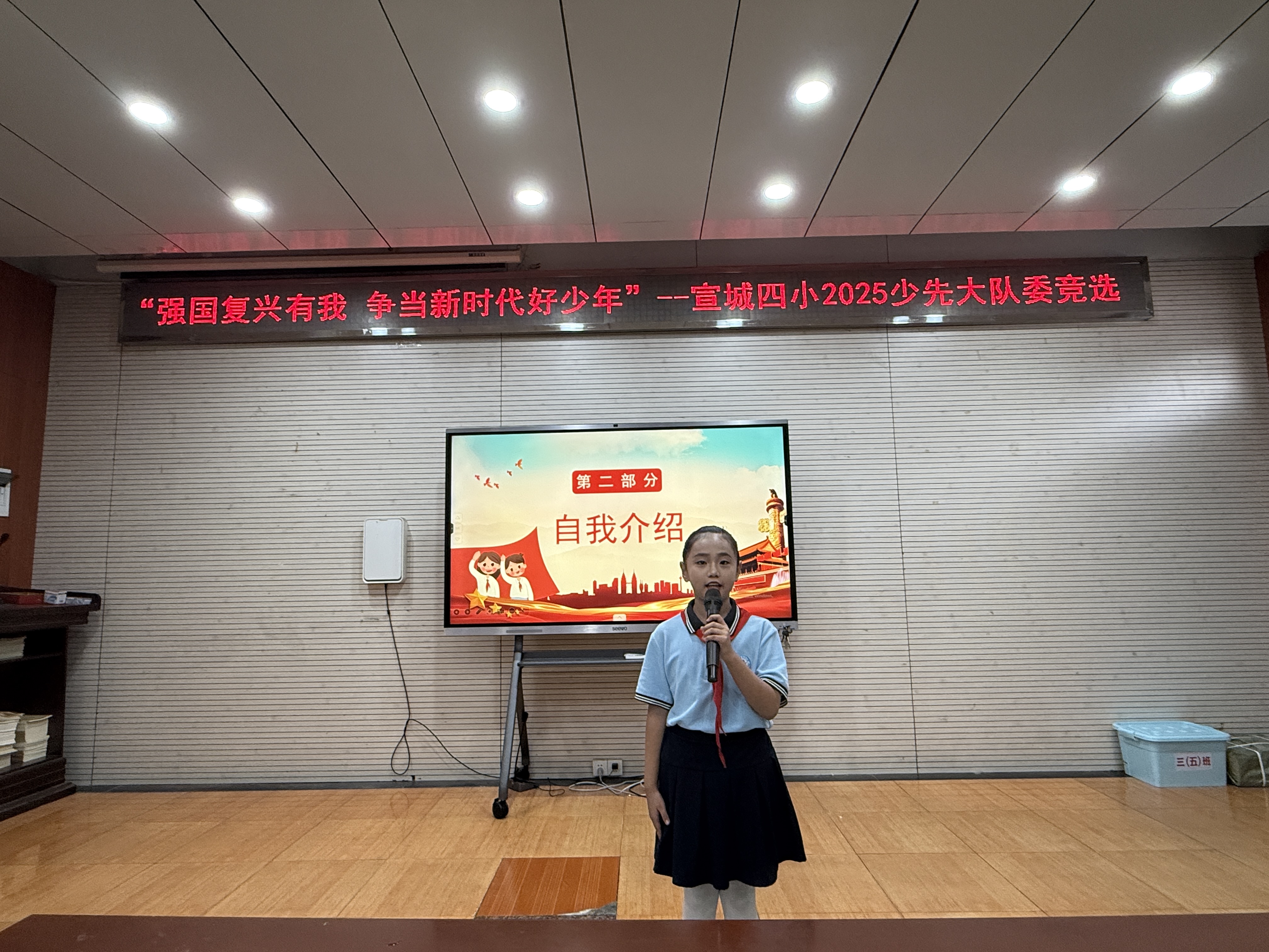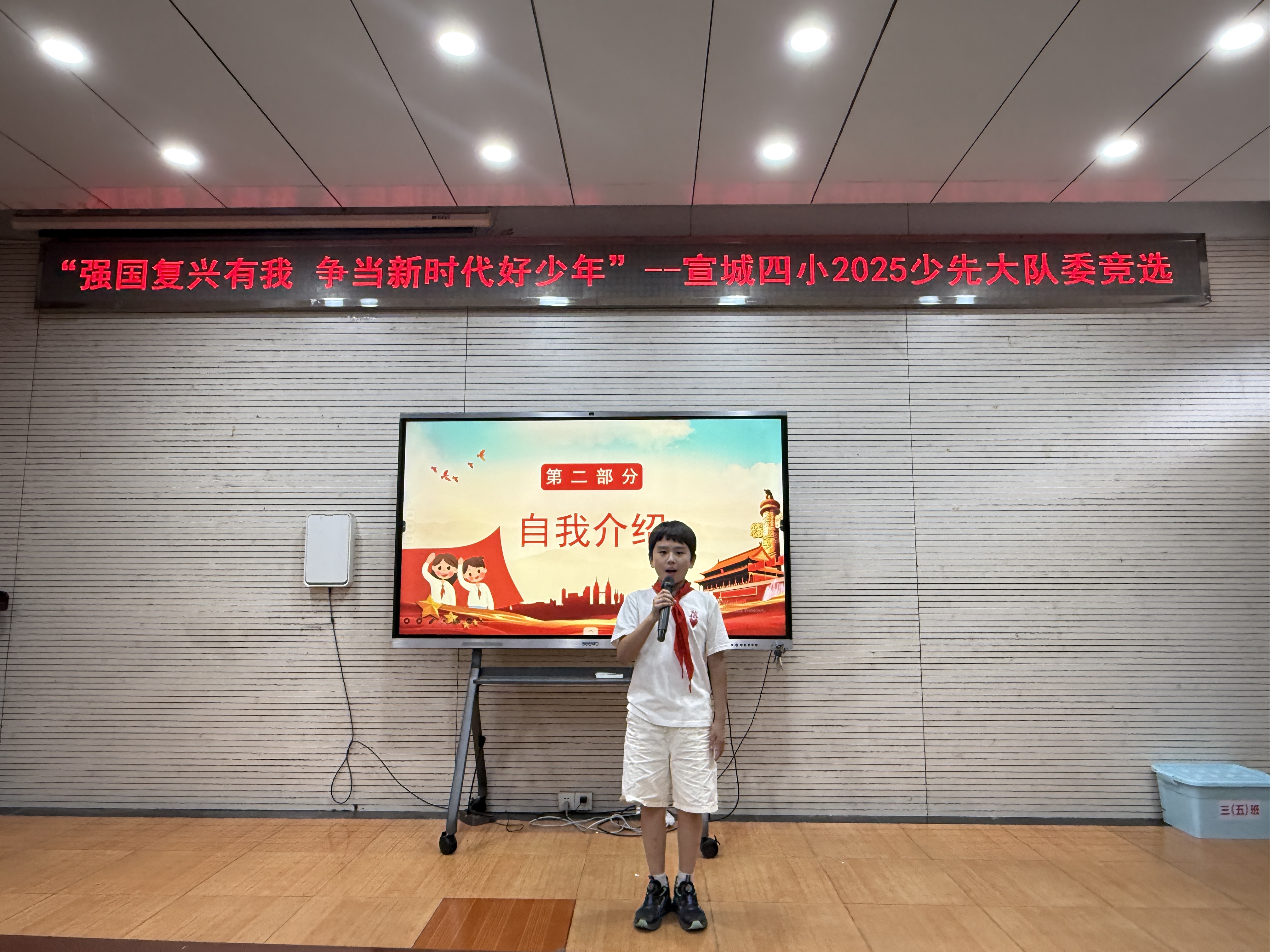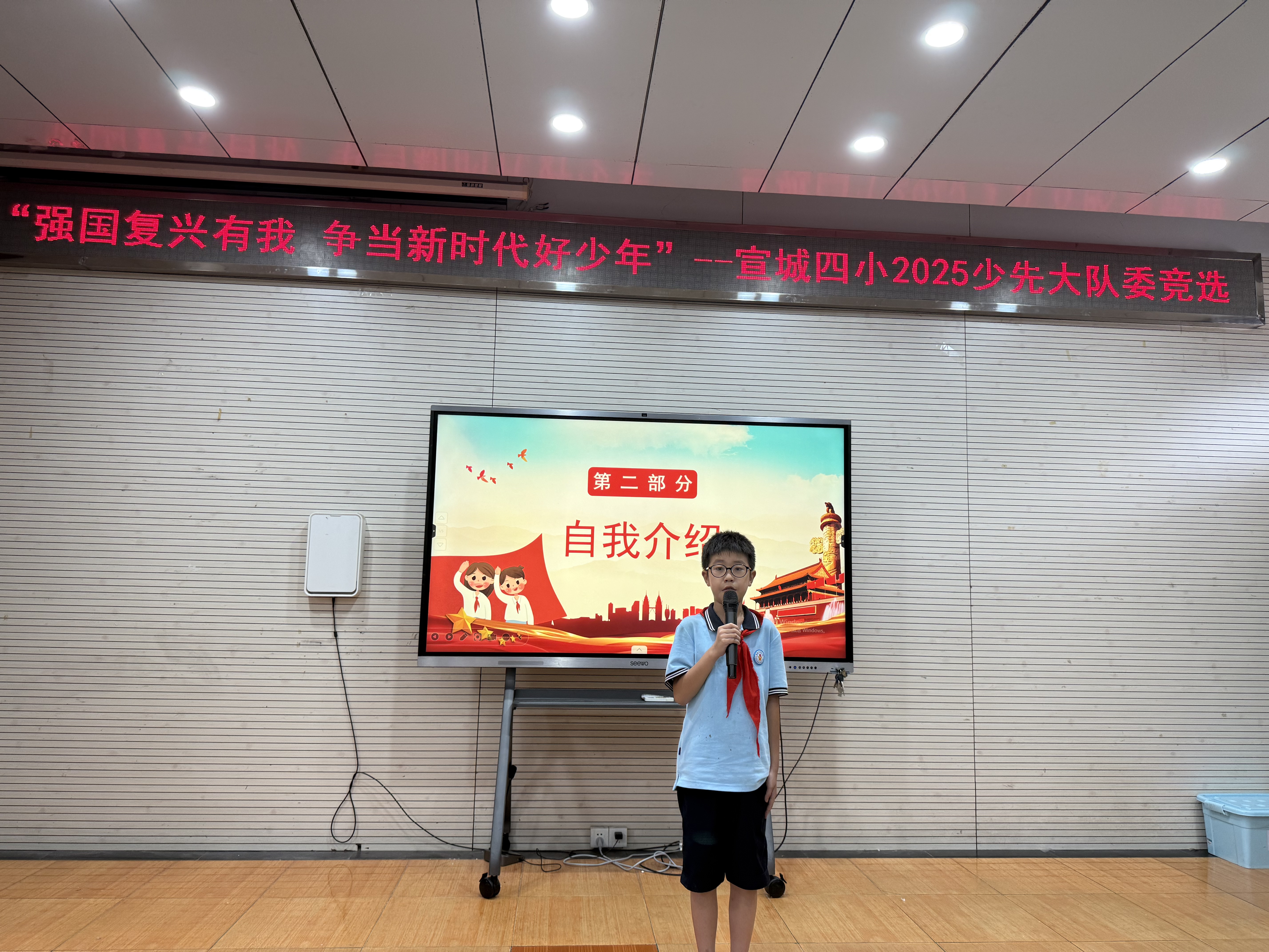 雏鹰展翅,志在蓝天。为了促进学校少先队工作发展,培养队员的组织和管理能力,形成“自己的活动自己搞,自己的阵地自己建,自己的事情自己管”的少先队工作新局面,9月23日下午,“强国复兴有我 争当新时代好少年”宣城四小2025学年少先大队委竞选活动在校阶梯教室隆重举行。经过四年级各中队推优,一批品学兼优、热心服务的少先队员齐聚一堂,展开了激烈的角逐。