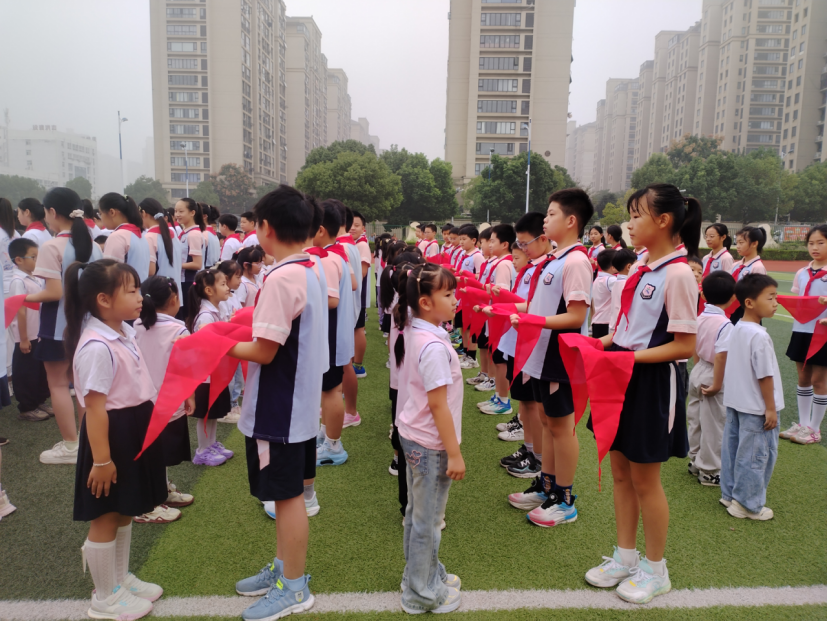 激昂的《出旗曲》奏响,旗手高擎中国少年先锋队队旗,步伐铿锵地出场,全体少先队员敬队礼,目光追随着鲜艳的队旗。紧接着,全场齐声高唱《中国少年先锋队队歌》,嘹亮的歌声响彻校园,激荡人心。