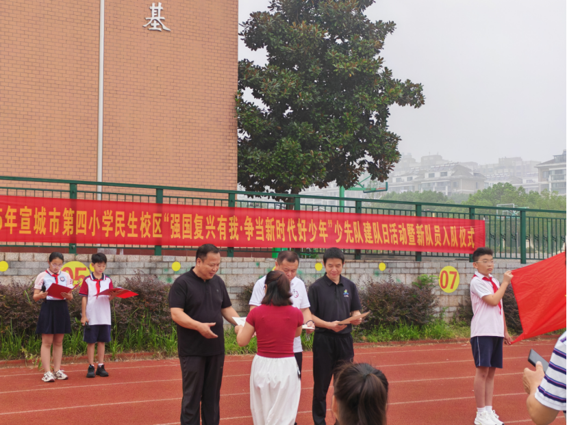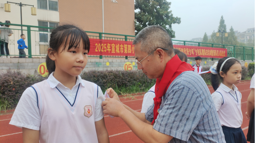 大队辅导员程娟娟老师首先宣布了新任辅导员的名单,并为新任辅导员们颁发了聘书。接着她郑重宣读了新队员名单,本次共有163名同学光荣地加入中国少年先锋队。在悠扬的《授巾曲》伴奏下,六年级的老队员代表们满怀关切地为新队员佩戴上鲜艳的红领巾,并共同完成了“立、托、放、系、压”的规范动作。红领巾在胸前飘扬,象征着革命精神的传承,场面庄重而温馨。
