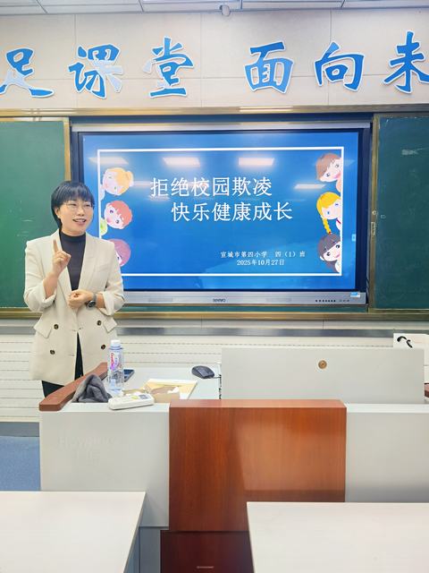 2025年10月27日上午,宣城市第四小学本部开展了第九十九期家长讲堂——《预防校园欺凌 健康快乐成长》。 本次讲座由四(1)班詹逸景同学家长,宣城市纪委监委二级监察官孟芬芳女士主讲。