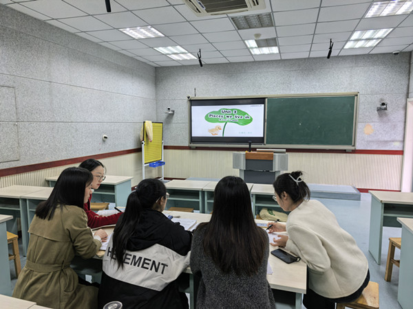 本次会议围绕单元整体英语教学,集中研讨各课时教学设计初方案,着重从教材内容分析、教学目标设定、项目活动任务安排及说课课件制作等方面重新调整和优化。