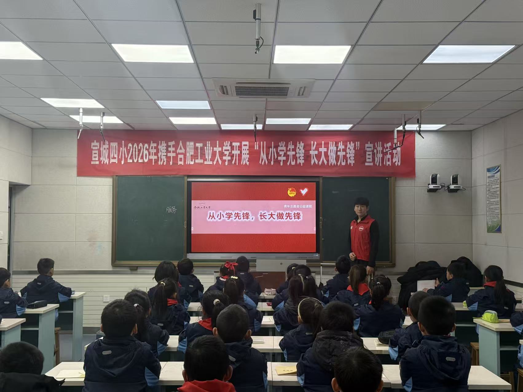 为了引导少年儿童学习先锋精神,树立远大理想,1月5日,宣城市第四小学携手合肥工业大学优秀师生宣讲团,在二6班开展“从小学先锋 长大做先锋”主题宣讲活动。