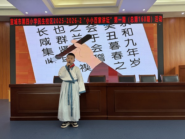 3月20日,民生校区“小小百家讲坛”活动迎来了第一期。本期由四(1)、四(2)两个班组织开展,围绕“少年传承中华传统美德”这个主题,六位小选手带来了精彩的故事,每个小选手都精神饱满,出色发挥,最终,四(2)班艾涵希同学带来的《铁杵成针》获得本次比赛冠军。(图、文/陈义民)