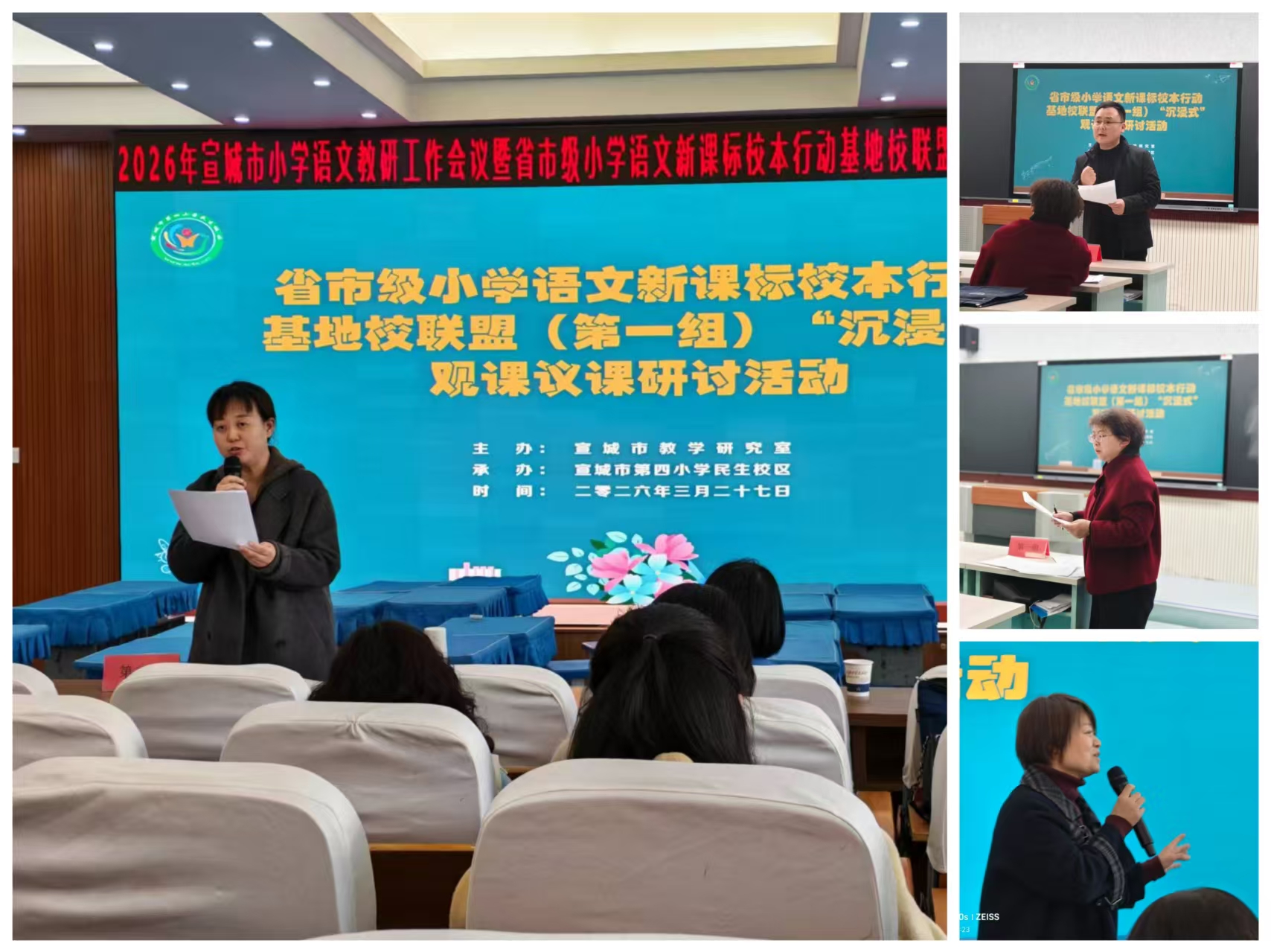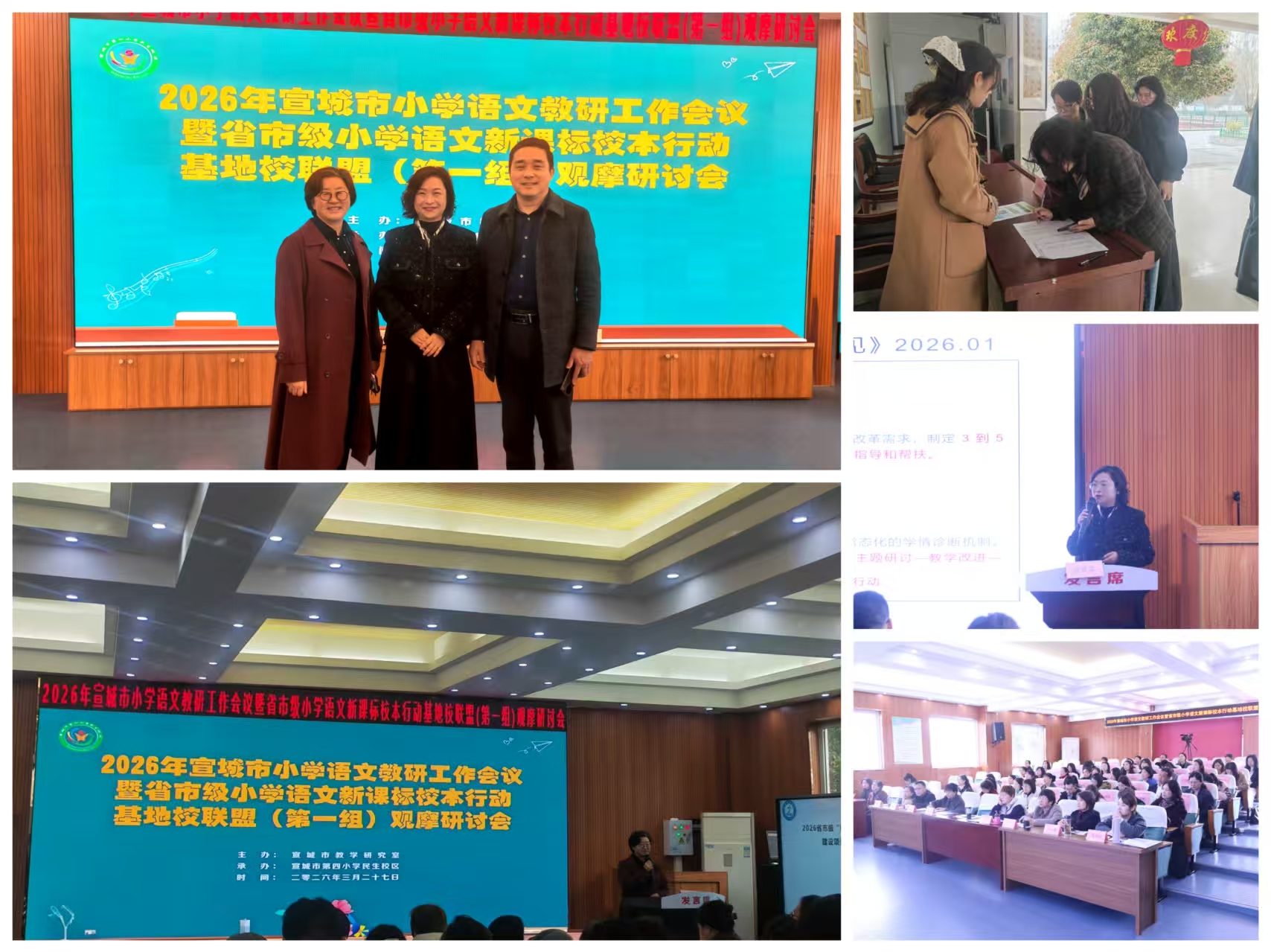 2026年3月27日,宣城市小学语文教研工作会议暨省市级小学语文“新课标校本行动基地校联盟”(第一组)教学研讨会在宣城市第四小学民生校区顺利召开。本次会议以新课标理念落地为核心,聚焦学与教方式改进,通过成果交流、教学观摩、沉浸式教研等多元形式,搭建起全市小学语文教研交流的优质平台,各县市区教研员、市县级专家指导团队成员、宣城市小学语文学科中心教研组成员、省市级基地校负责人、骨干成员、省市级基地校联盟校(第一组)骨干成员齐聚一堂,共研教学提质之路。