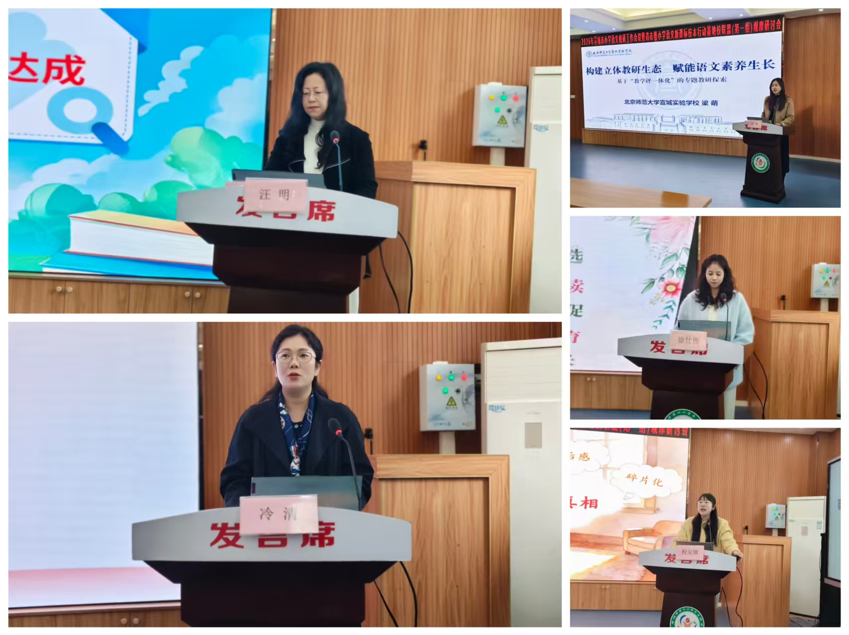 会议第二项是基地校联盟校(第一组)阶段性经验交流。宣城市第四小学民生校区基地校负责人汪明带来《基地校深耕细研 多元赋能启新篇》的报告,从基地校建设概况与目标达成、基地校研究过程、2025年成果、存在问题改进和后续计划四方面,全面展现基地校建设的实践路径;北师大宣城实验学校梁萌以《构建立体教研生态,赋能语文素养生长——基于“教学评一体化”的专题教研实施计划》为题,从指导思想、预期目标、具体措施维度,阐释教学评一体化的教研探索;泾县城关第四小学程安琪围绕《快乐读书吧:基于童心视域的小学低段语文整本书阅读的实践教学研究》,提出读懂童心是教学前提,明晰低段阅读教学边界,分享贴合童心的实践路径;宁国市津北小学冷清作《根植革命文化,研“学教”促成长》汇报,从工作推进、活动开展、成效总结及改进方向四个方面,交流校本教研基地校的实践经验;宣城市第四小学民生校区徐仕俊带来《共读时光,悦见成长》分享,从书籍共选、课程引读、激励督促、家校共育、共话成长五维度,讲述整本书阅读的校本实践。