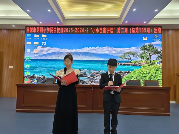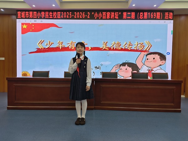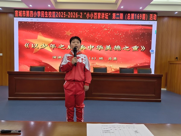 4月10日上午,四小民生校区开展了第二期“小小百家讲坛”活动。本期讲坛活动由四(3)和四(4)班组织开展。围绕“中华传统美德”这个主题,六位参赛选手带来了精彩的演说,每个小选手都精神饱满,出色发挥,最后,四(4)班罗禹桐同学带来的《少年有责 美德传扬》朗诵获得本次比赛冠军。